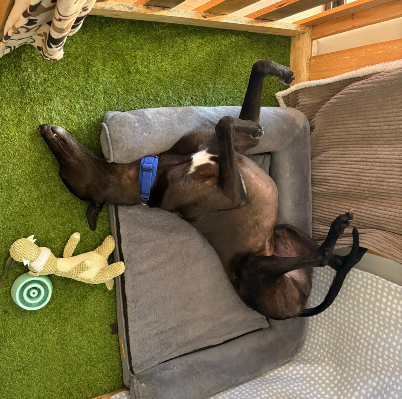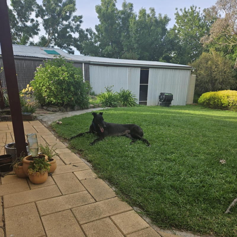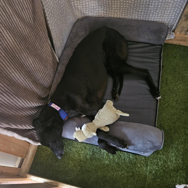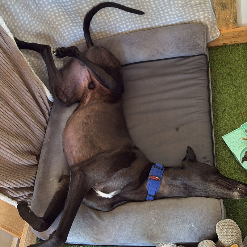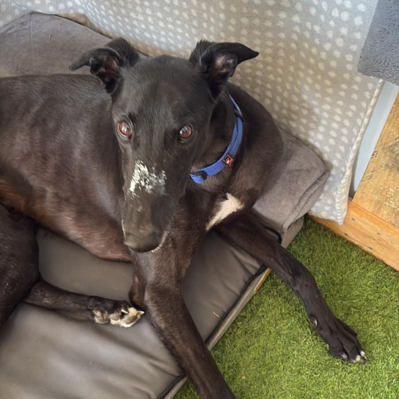 Arrow raced under the name ‘Cyclone Arrow’. He's an easy going and sweet soul, looking for a home where he will receive lots of love, cuddles, and attention. He loves a bum scratch and has experience spending time in his trainer’s home