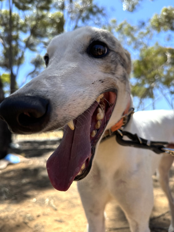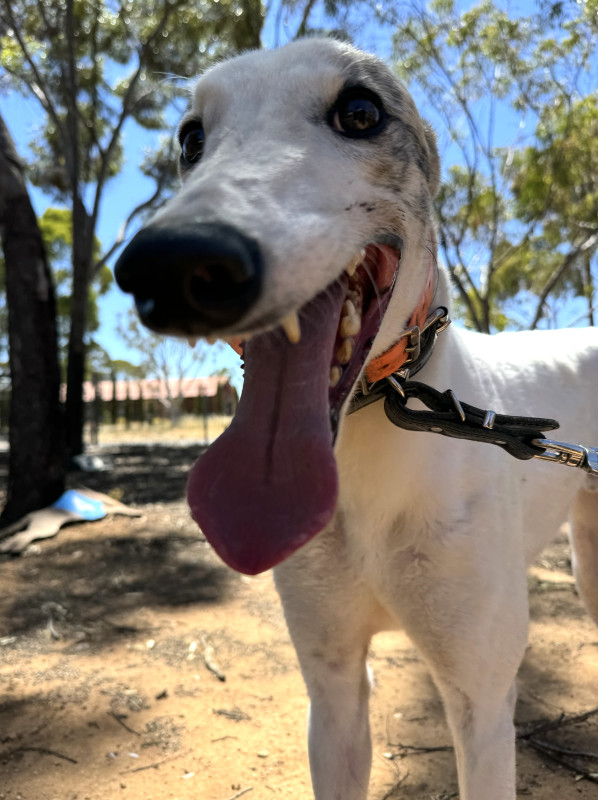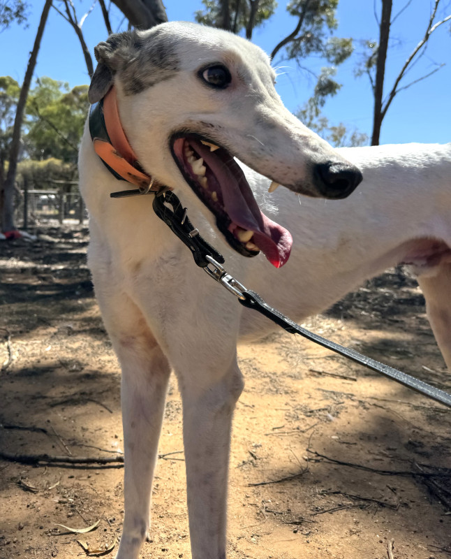 Snowy never raced and decided that the spoilt life of a greyhound pet was what he wanted in life.